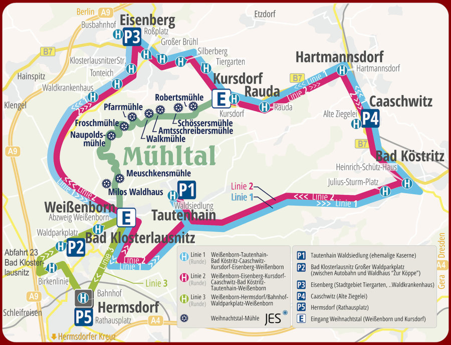 P4 = Parkplatz Caaschwitz (ehem. Ziegelei) mit über 300 Parkplätzen. In der Nähe kann in Silbitz oder im Gewerbegebiet Crossen geparkt werden. Dazu gibt es Bushaltestellen am Parkplatz in Caaschwitz und an der B7 in Hartmannsdorf (Richtung Eisenberg), nur ein paar Schritte vom Kreisverkehr. Die Linie 1 verkehrt in Richtung Weihnachtstal nach Kursdorf und dann über Eisenberg weiter nach Weißenborn. In umgekehrter Richtung nutzen Sie die Linie 2 in Richtung Weißenborn. Sie können also beide Taleingänge erreichen.